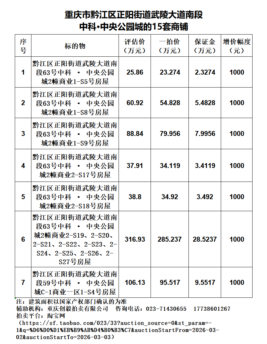 二拍 重庆市黔江区正阳街道武陵大道南段63号中科·中央公园城的14套商铺(详见附件清单)